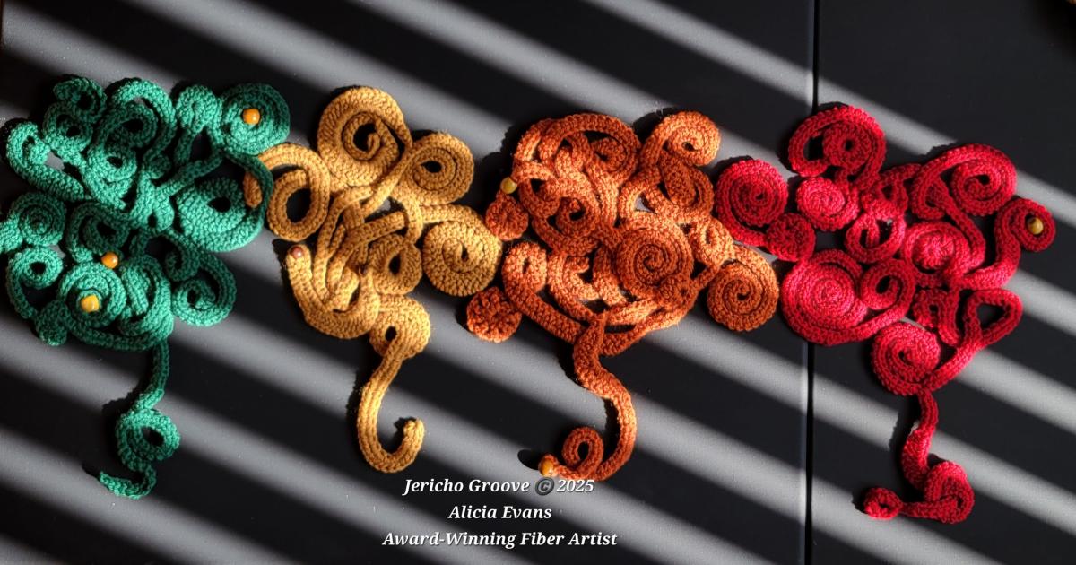 A Crocheted fiber trees become living symbols of resilience and renewal in this contemplative exhibition. Rooted in the spirit of Jericho yet reaching beyond, award-winning fiber artist Alicia Evans invites viewers to reflect on nature, memory, and the stories that connect us all.