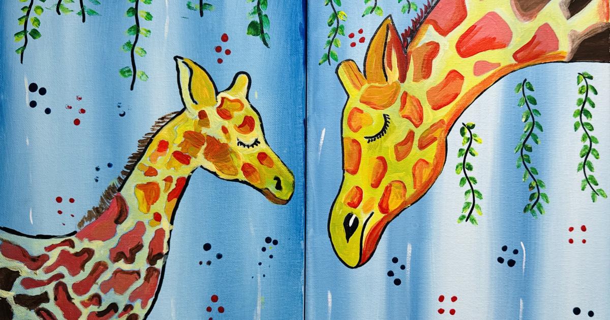 A parent and teen each paint their own giraffe canvas, creating two separate pieces that gently lean toward each other when placed side by side. This simple, sweet artwork celebrates connection, trust, and the quiet comfort of being close—even while growing in different directions.